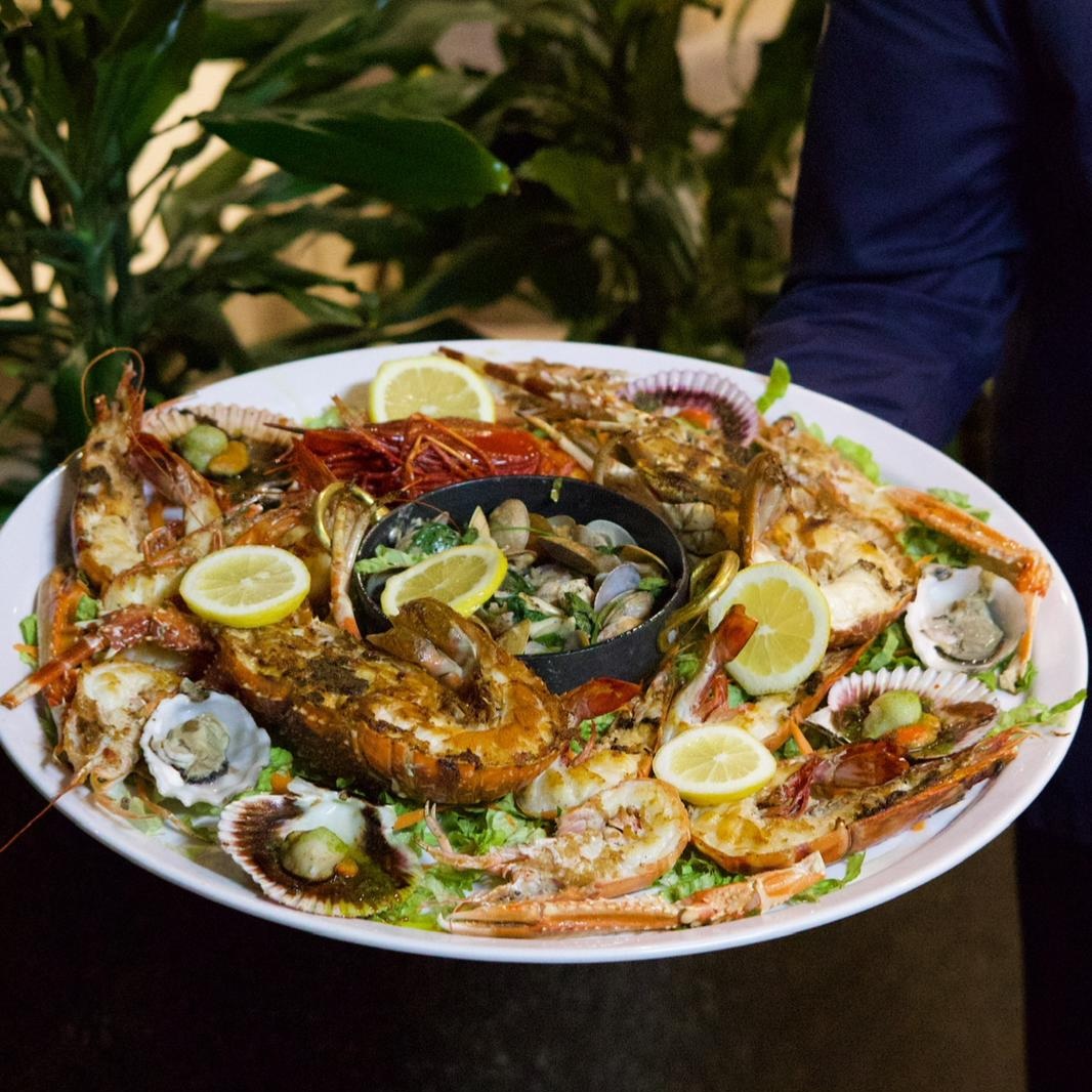 Variado de mariscos grelhados que inclui: lavagante, tigre, carabineiro, lagostim, camarão gigante, ostras e amêijoas